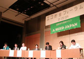 5名のパネリストによるパネルディスカッションでは、各金融機関のCSRビジョンや取り組み等を発表していただきました。多摩中央信用金庫の長島さんの「地域のコンシェルジェ」、東京三菱銀行の田貝さんの新入社員向けCSR研修のお話、WCC向田さんのNPOバンクならではの融資事例紹介、三重銀行の土方さんの「Jマネー定期」のわかりやすい解説、地域金融の話題から国債の話まで、盛りだくさんな内容でした。 最後に、預金者へエコ貯金アクションを呼びかけて終了しました。