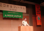 フォーラムは、A SEED JAPANからエコ貯金の意義や預金者の役割についてのプレゼンテーションでスタート。基調講演では、日本の金融CSRと市民金融の動向について、日本経済新聞社の藤井良広氏よりお話いただきました。「これからはコミュニティの信頼が金融機関にとって重要」というメッセージが印象的でした。